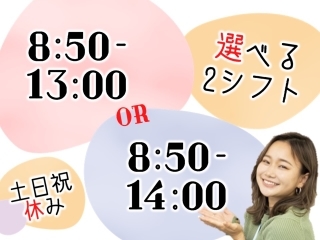 | 勤務時間 | [1]08:50〜13:00(実働: 4.16時間) [2]08:50〜14:00(実働: 5.16時間) ※1日の勤務時間が6時間を超える場合は45分以上、 8時間を超える場合は1時間以上の休憩あり 【勤務時間補足】 月~金のうち週3日からOK(土日祝休み) *他時間帯、フルタイムシフトもご用意 *入社後のシフト変更も相談可 *応援出勤も大歓迎 *短時間OK/扶養内勤務OK *副業・WワークOK *週4日以上、週5日勤務もOK *家庭都合休みも応相談 *固定シフト制 【月収例】 ●週3日の扶養内で働く主婦さん 6万2496円+交通費 (時給×4時間10分×12日) ●週5日で働くフリーターさん 13万5618円+交通費 (時給×5時間10分×21日) |