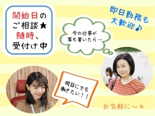 | 給与 | 時給1,350円〜 【給与補足】 時給1350円+交通費支給 *高時給/高収入のお仕事 【出勤率により最短4ヶ月で時給1400円も可能】 *査定時期(3月、6月、9月、12月) 詳しくは面接時お気軽にお尋ねください^^ 【月収例】 ●週4日勤務の場合 ⇒17万2800円+交通費 (時給×実働8時間×16日) ●週5日勤務の場合 ⇒22万6800円+交通費 (時給×実働8時間×21日) |